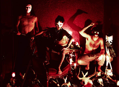angstaanjagende attributen zoals pantervellen en koeienschedels.