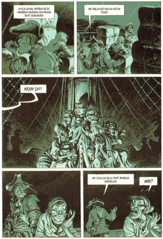 We mogen in onze handjes wrijven dat Reb’s deze taak op zich heeft genomen. Eerst dacht ik: “Pfff, weer een piratenstrip”, maar deze is toch anders dan de rest. Naar alle waarschijnlijkheid heeft het originele boek daar veel mee te maken. Aan de teksten in dit boek hangt wat meer vlees dan in de doorsnee strip. Het verhaal heeft niet echt een plot en bestaat uit korte chronologische verhalen over een jongen die piraat wordt en later, als oude en verbitterde man, terugkijkt op zijn leven. De kracht van de verhalen ligt enerzijds in de historische correctheid, Reb’s heeft zich enig opzoekwerk gepermitteerd, en anderzijds in de poëtische benadering van de piraat. Eenzaamheid, verliefdheid, woede, moordlust: allen aanwezig. De verhalen variëren van zeer goed tot slechts entertainend. Enkele slagen er niet meteen in om de inhoud of de sfeer die Reb’s waarschijnlijk wilde overbrengen uit te beelden. Een roman adapteren is geen makkelijk werk, men moet zeer kundig zijn in het kiezen wat je overbrengt en wat je weg laat.
